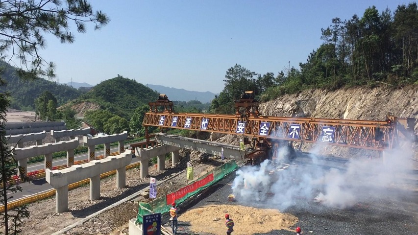 日上午,伴隨著喜慶的鞭炮聲,在項目部領(lǐng)導(dǎo)班子的現(xiàn)場指導(dǎo)下,梅公橋首片箱梁架設(shè)成功。