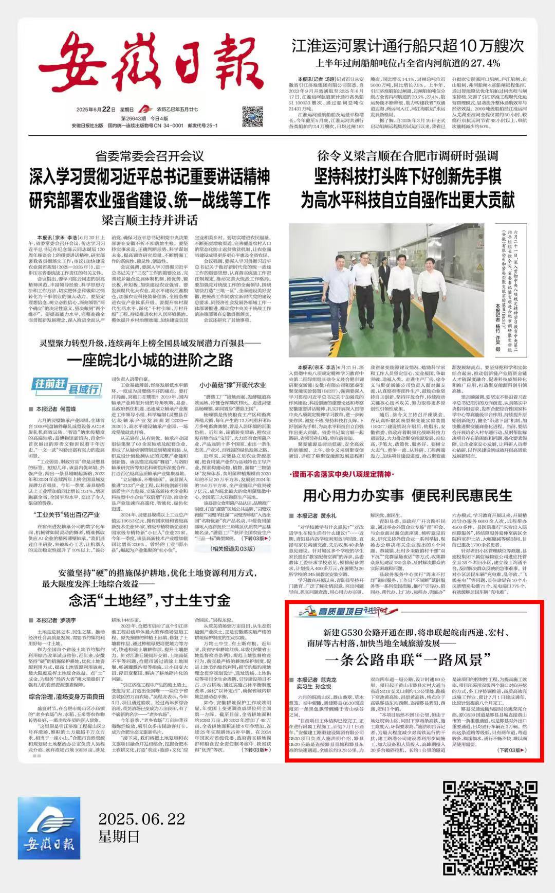 日前,安徽日報以“一條公路串聯(lián)‘一路風景’”為題,頭版專題報道了建工路港公司承建的黟縣G530項目建設(shè)情況。